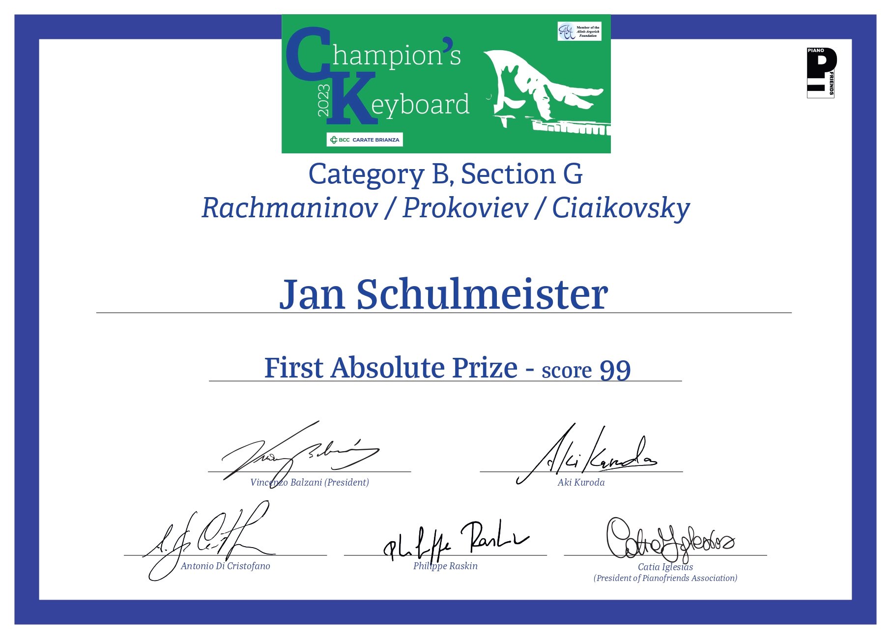 One of the youngest members of the PETROF Art Family, pianist Jan Schulmeister, won the first absolute prize in an international piano competition "Champion's Keyboard", organized by the Milanese music company Piano Friends, which is a member of The Alink-Argerich Foundation.