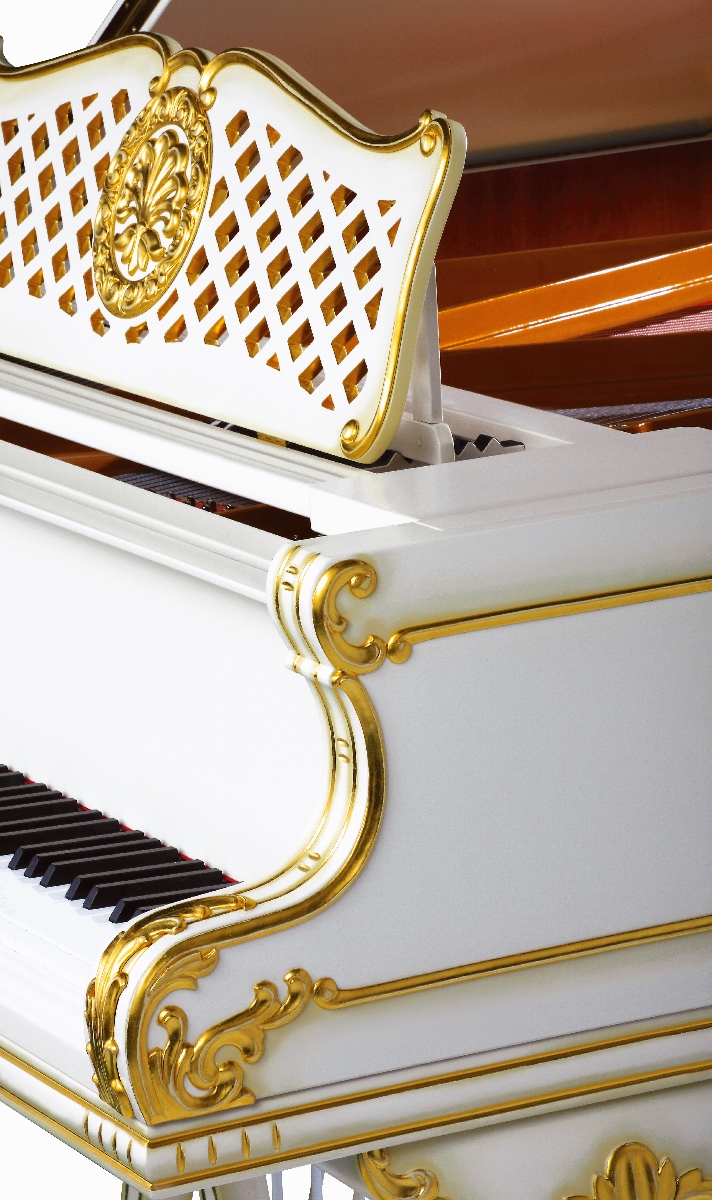 Ni al piano Rococo Gold no le falta el tono redondo romántico, característico de los instrumentos PETROF. Pero lo que diferencia este piano de cola es su estilo de rococó y su color de marfil y con unos elementos decorativos de oro. Gracias a todo esto, el modelo Rococo Gold cabe muy bien a interiores de un estilo similar. Para la decoración del piano utilizamos unos platos de oro.